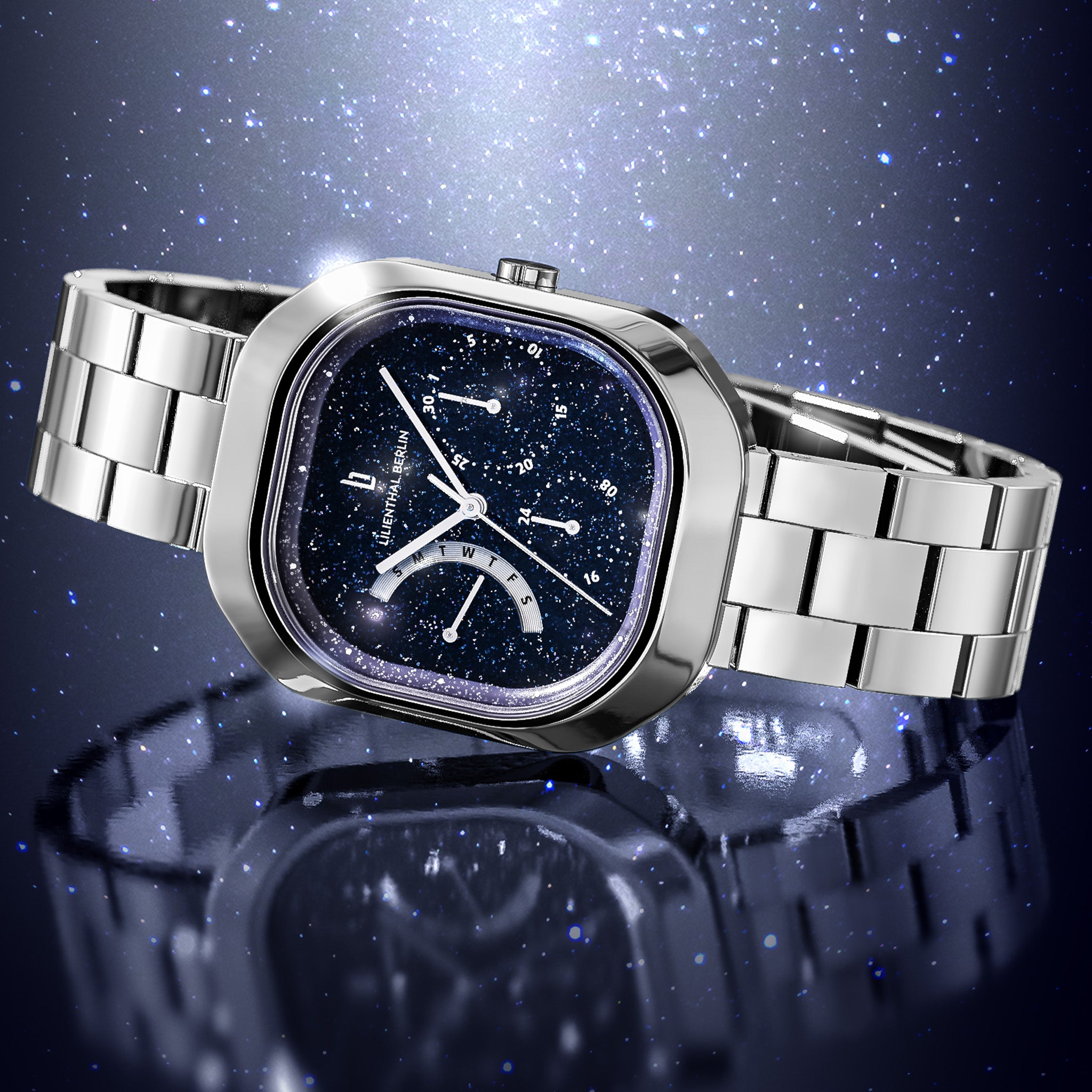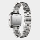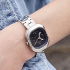 - Skulpturale Eleganz: Das rechteckige Gehäuse mit sanft abgerundeten Ecken schafft eine raffinierte Silhouette, die diese Uhr wie ein Schmuckstück am Handgelenk wirken lässt.